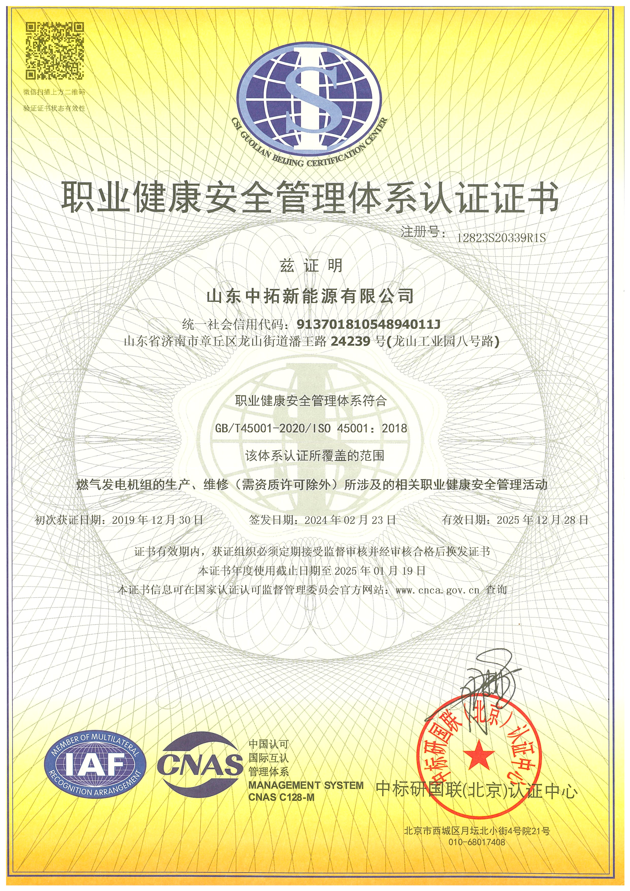 職業(yè)健康安全管理體系認(rèn)證證書(shū)