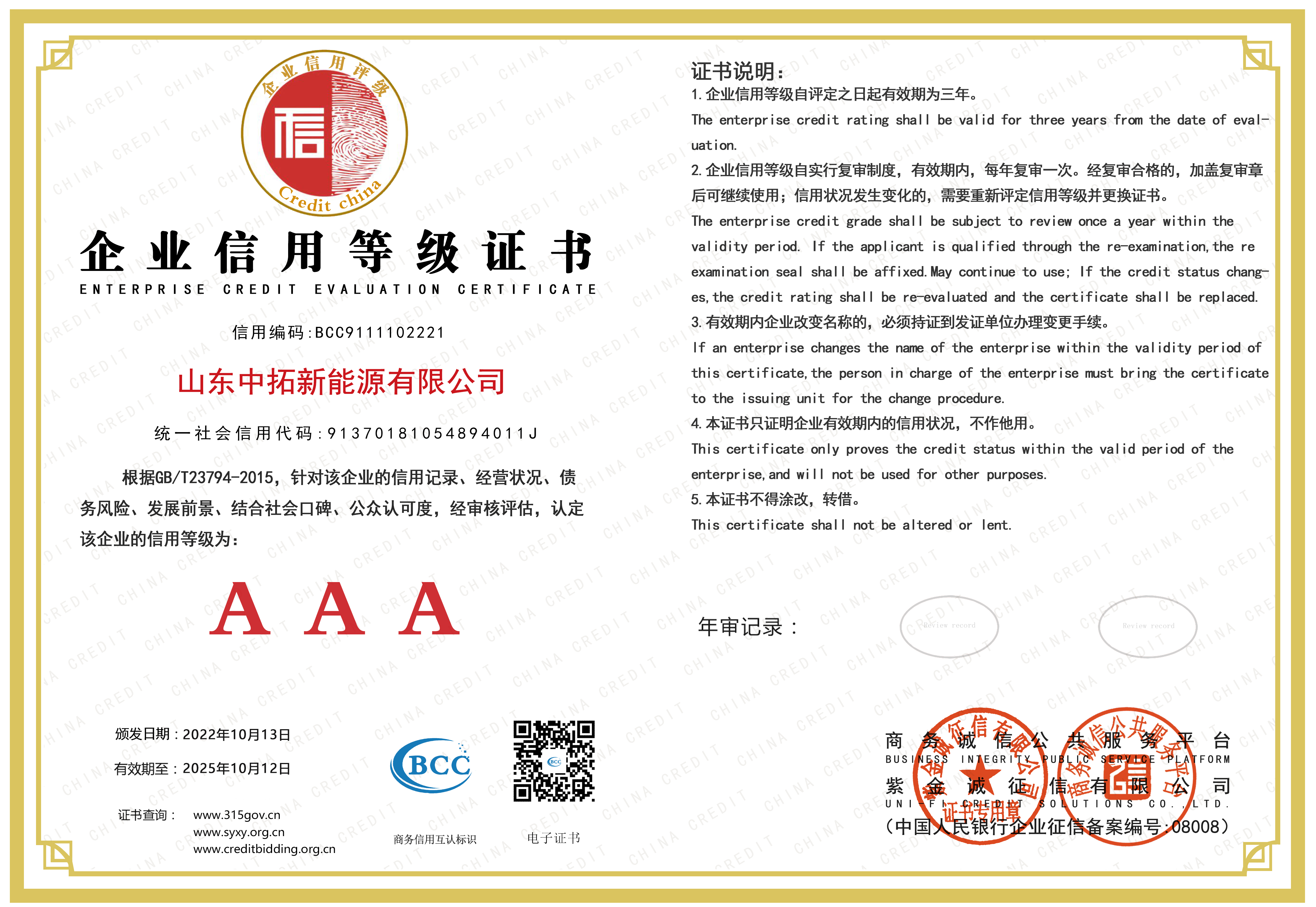• AAA級(jí)企業(yè)信用等級(jí)